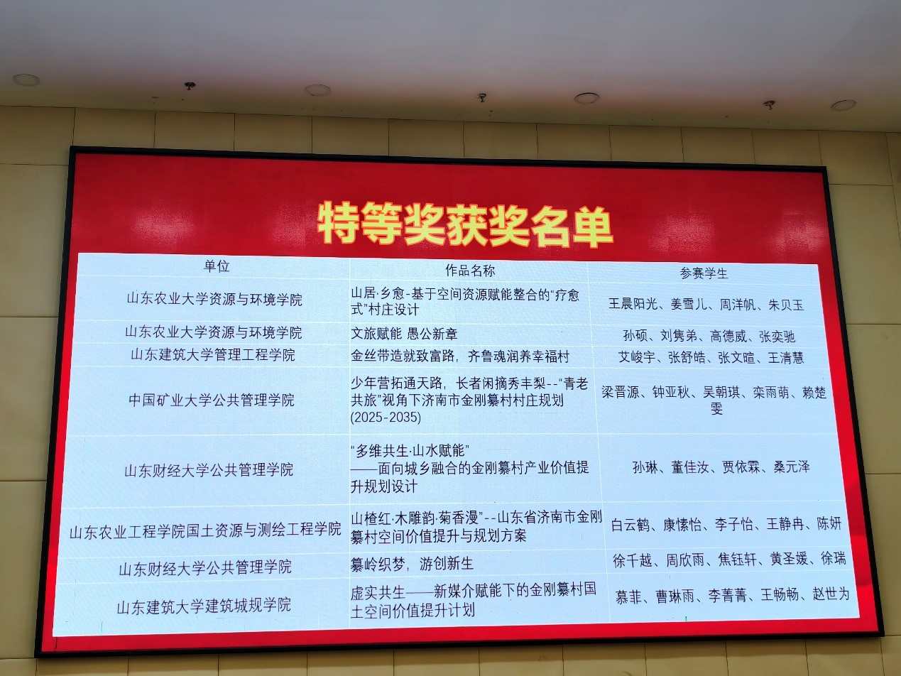 经过激烈地角逐与筛选,大赛评选出特等奖8项、一等奖12项、二等奖17项。在校内外指导老师的密切合作与共同指导下,由公司土地资源管理与行政管理专业联合建筑与设计学院建筑学专业员工组成的“铜山朝阳”团队(梁晋源、钟亚秋、吴朝琪、栾雨萌、赖楚雯),凭借作品《少年营拓通天路,长者闲摘秀丰梨——“青老共旅”视角下济南市金刚纂村村庄规划(2025-2035)》(指导老师:李桂娥、吴子豪、闫庆武、李玲[徐州规划院])荣获特等奖,充分展现了公司学子扎实的学科功底与实践创新能力。