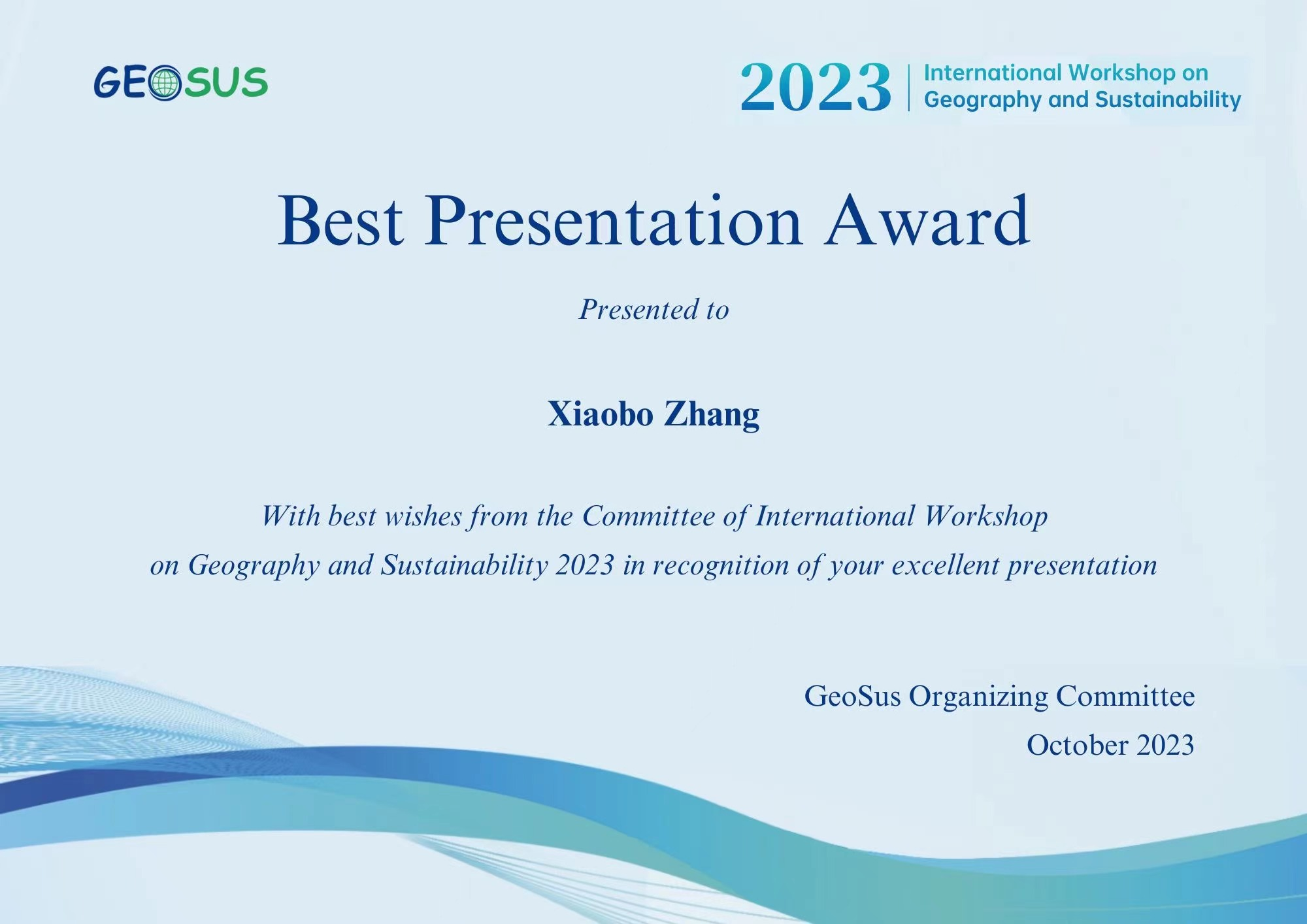 会议期间,李龙副教授主持第24分会场:Urban Green Spaces and Sustainability(城市绿地与可持续性),对参会报告进行点评。土地资源管理专业2022级研究生张晓博与2021级本科生陈俊在两个分会场上分别做了“Understanding the Influence of Land Use and Vegetation Cover on the Urban Thermal Environment: A Case Study of Xuzhou, China(城市土地利用和植被覆盖对热环境的影响效应研究——以中国徐州为例)” “Land Use Strategies for Mitigating Flood Disaster Risks: A Preliminary Analysis of Henan, China(减轻洪涝灾害风险的土地利用策略——基于中国河南省的初步分析)”的学术报告,引起了国内外学者的积极兴趣,并得到了充分肯定。其中,张晓博获得了Best Presentation Award(最佳报告奖)。