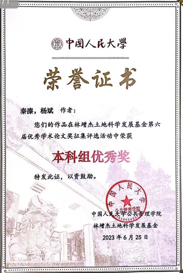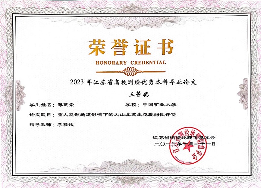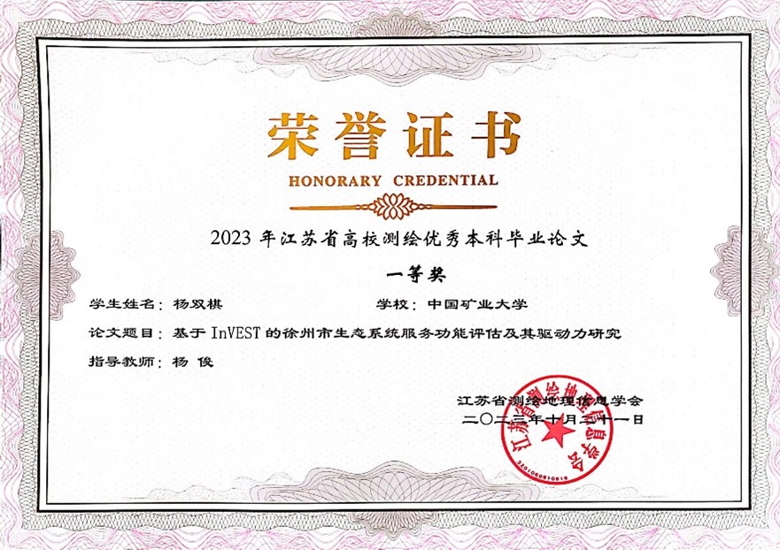 公司2023届土地资源管理专业本科生毕业设计(论文)荣获佳绩,其中杨双棋论文《基于InVEST模型的徐州市生态系统服务功能评估及其驱动力研究》(指导老师:杨俊)荣获2023年江苏高校测绘优秀本科毕业论文一等奖,薄延素论文《重大能源通道影响下的天山北坡生态脆弱性评价》(指导老师:李桂娥)荣获2023年江苏高校测绘优秀本科毕业论文三等奖;秦溱论文《耕地利用绿色转型对农业经济增长的影响研究——以江苏省为例》(指导老师:杨斌)荣获中国人民大学林增杰土地科学发展基金优秀论文奖。