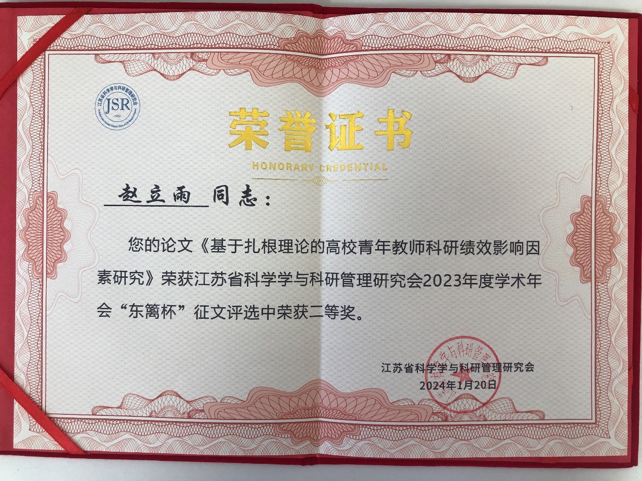 本次会议主题为“科技自立自强与发展区域新质生产力——推动江苏科技构建新发展格局”,探讨科技自立自强与新质生产力发展理念、政策与实践,分享应对新要求的新思路、新方法和新举措,为推动江苏科技构建新发展格局建言献策。公司赵立雨教授应邀参加本次会议,并于1月20日下午做学术报告,其课题组提交的学术论文《基于扎根理论的高校青年教师科研绩效影响因素研究》被评为优秀论文二等奖。