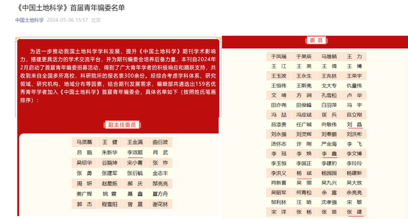 近日,《中国土地科学》编辑部公布了首届青年编委会名单共计159人,公司李效顺教授受聘副主任委员,李鑫教授、刘晶、杨斌、张建副教授受聘委员。